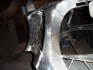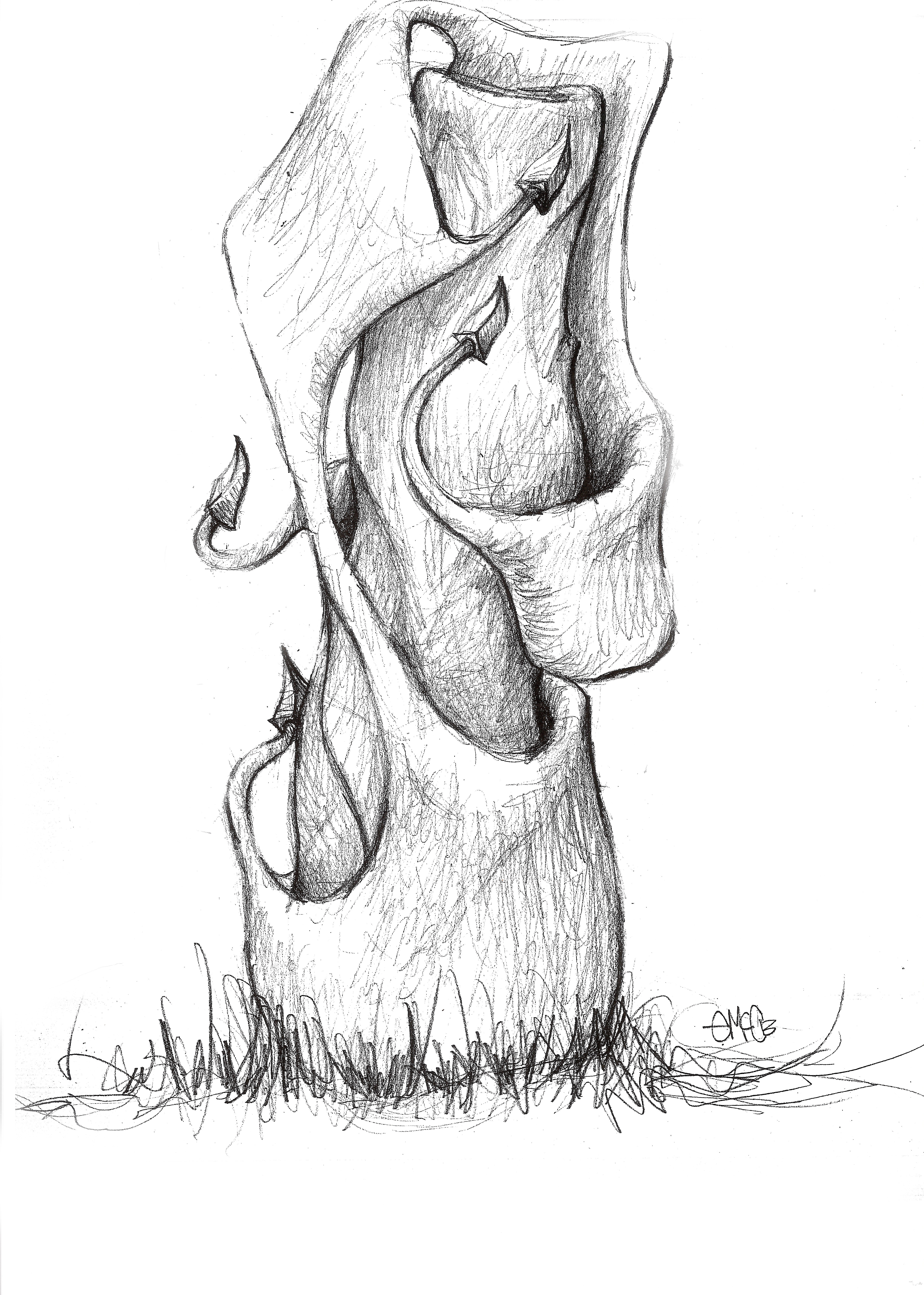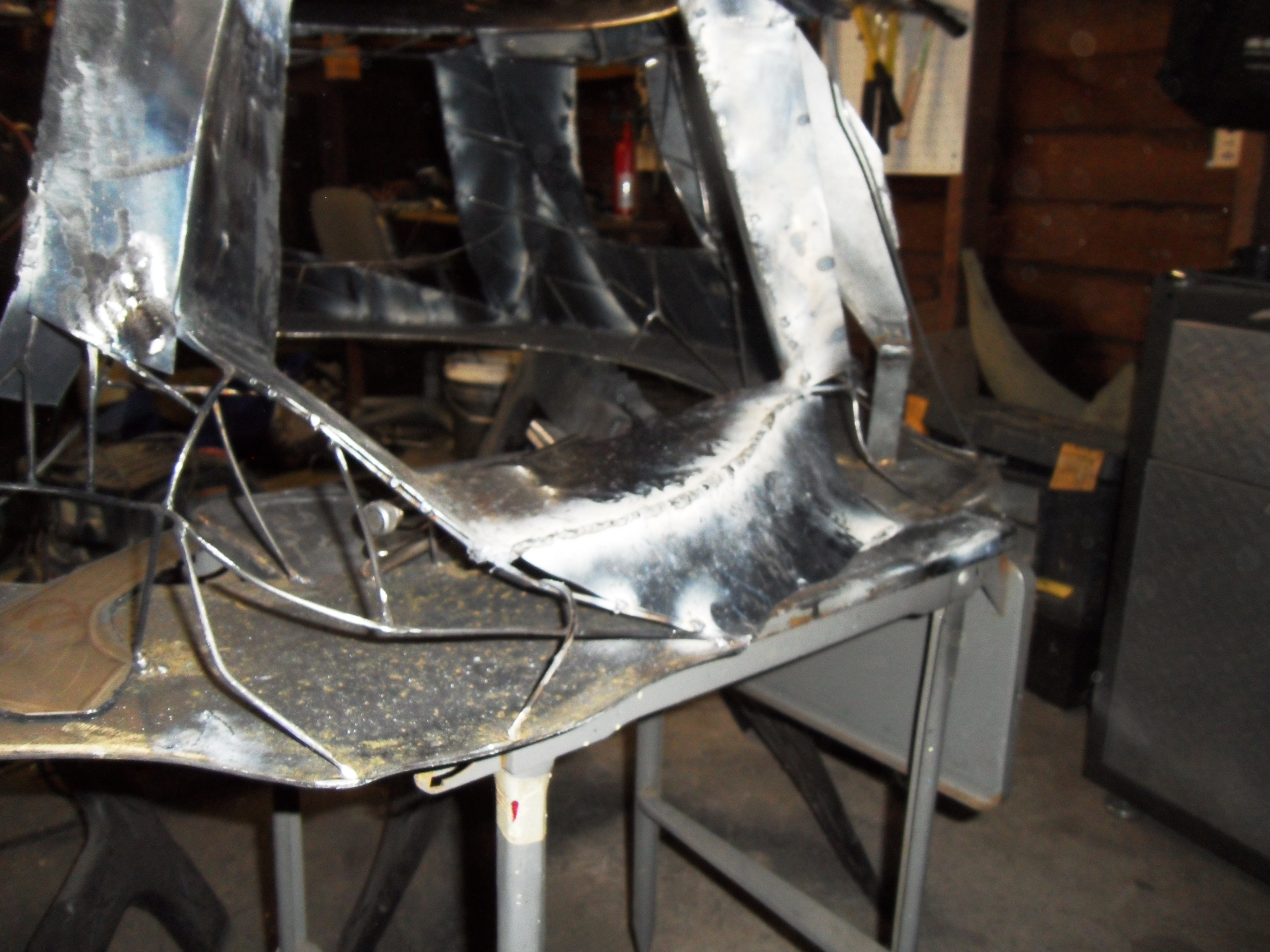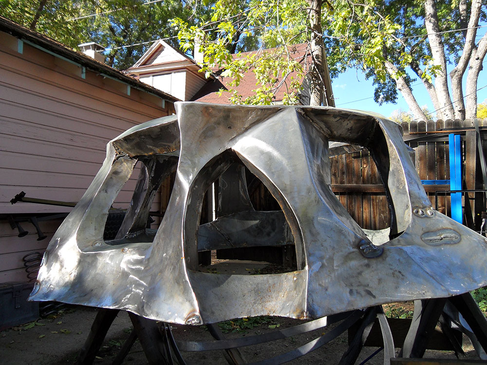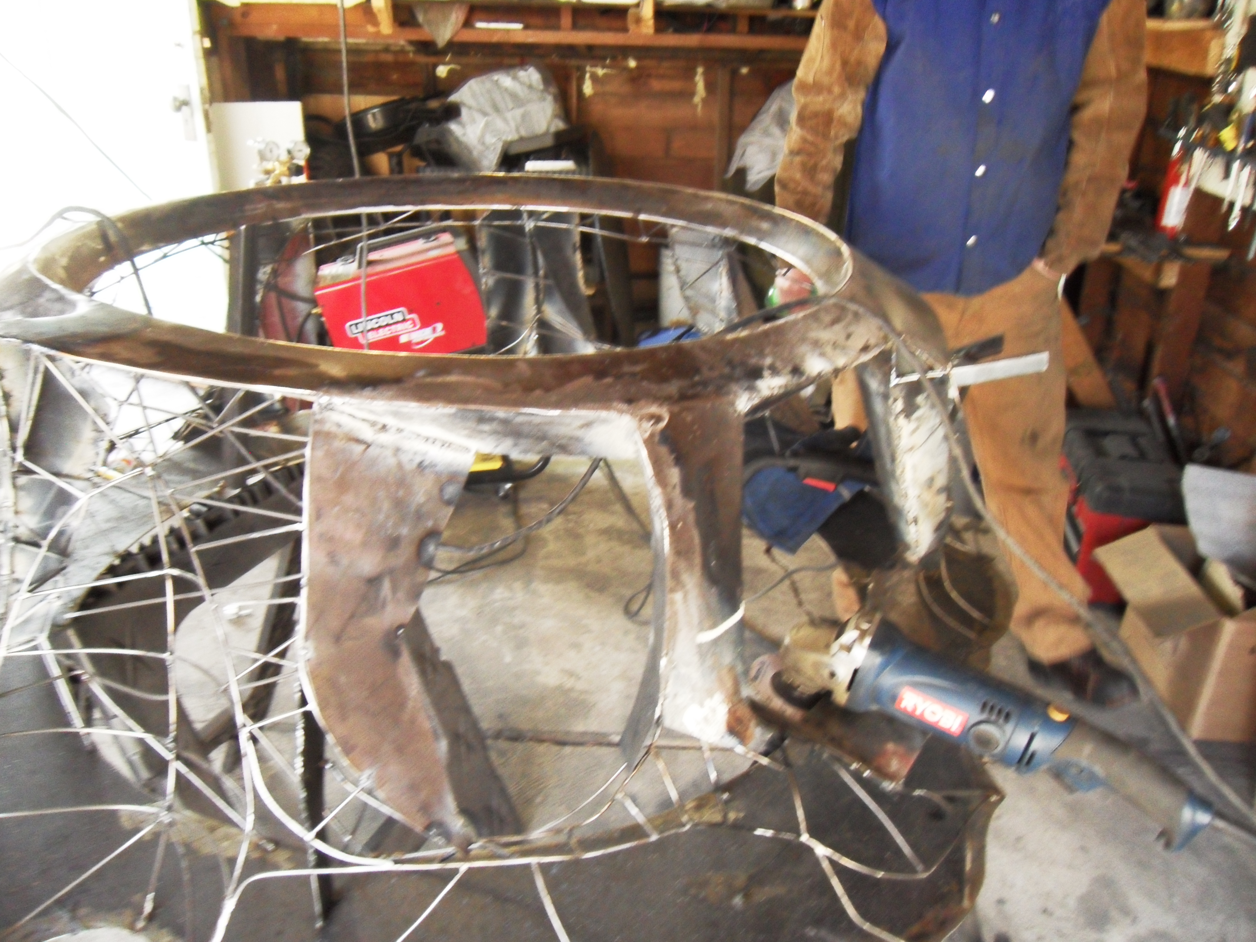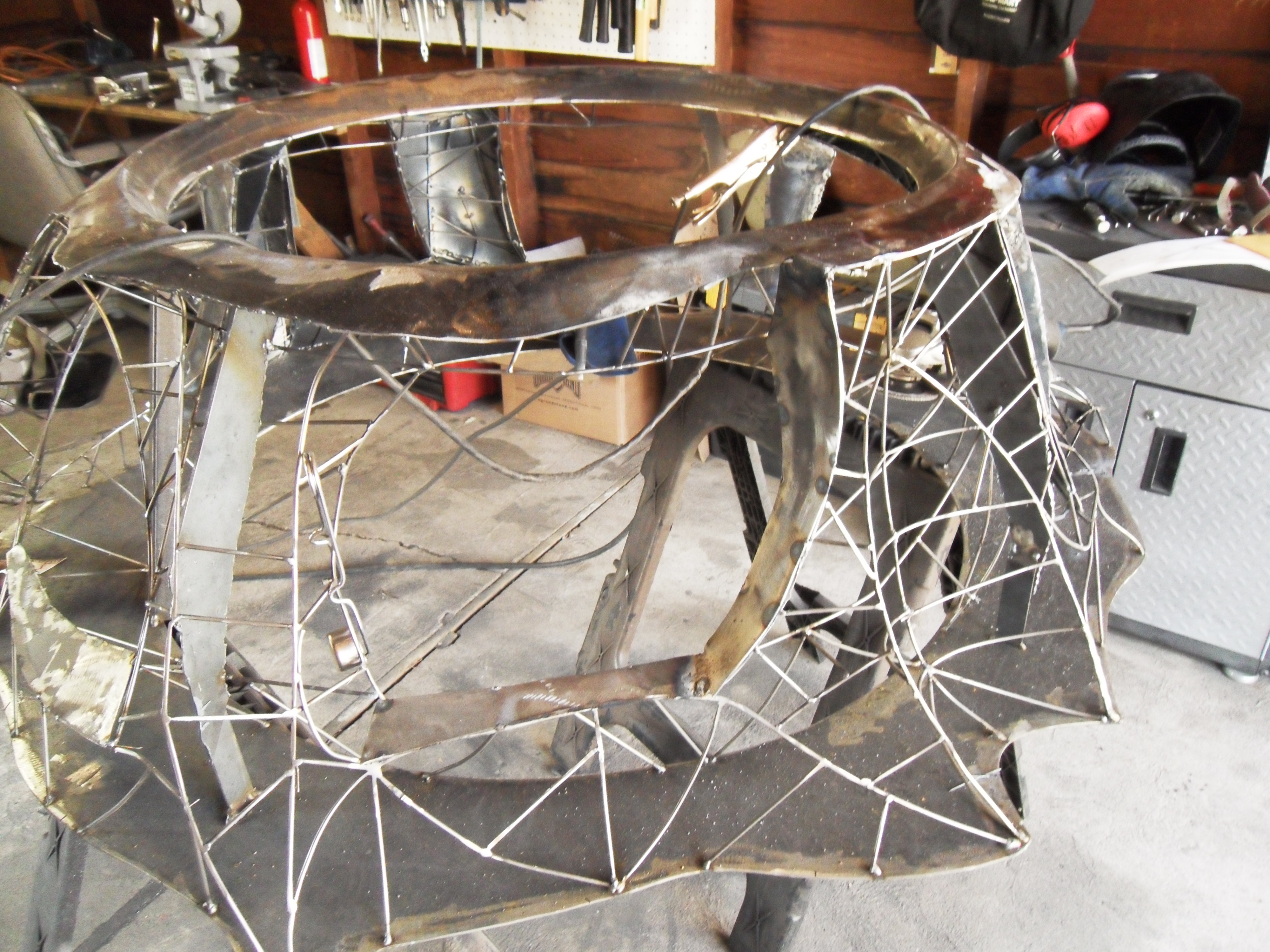 This fire pit is a seven-legged 16 gauge steel fire pit specifically designed for viewing an intriguing, unique design when walking around each angle of the fire pit. It was MIG welded and the final design will be black patina to accentuate the angles. The inside features a lifted, removable cylinder fire cage made with expanded metal and a dome top which opens to two sides.