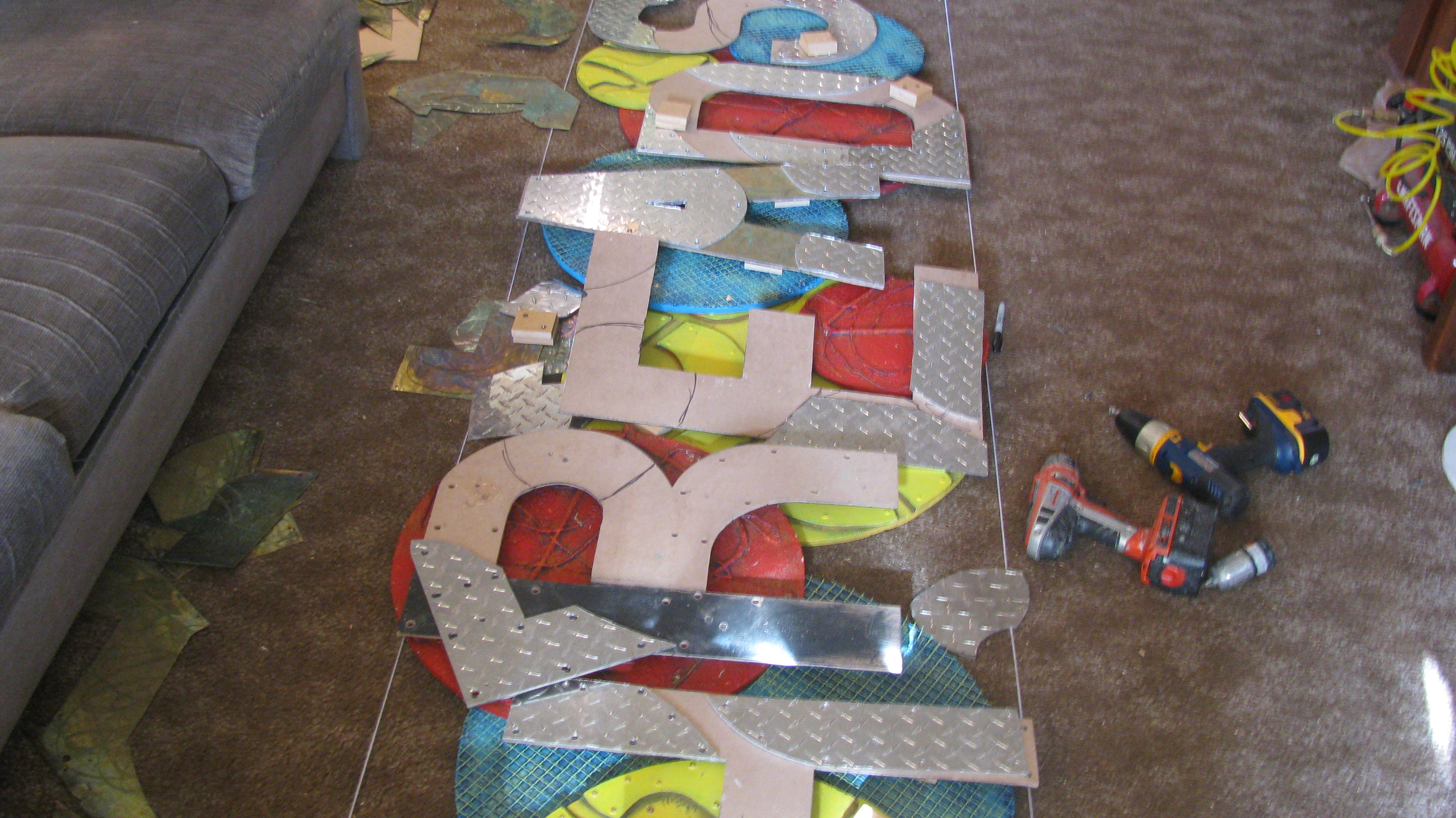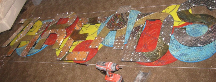 The Threads sign is a custom-built sign for Goodwill Industries of Colorado Springs. It is a mixed media piece made of plywood, rope, sand, acrylic paint, brass, diamond plate, wire mesh and stainless steel nuts and bolts. It is currently located at the Goodwill location at Circle and I-25. The sign is 12′ wide by 30″ tall and was assembled onsite in three pieces with a crew.